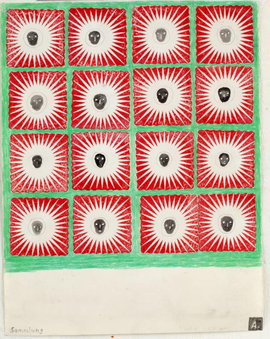 Sechzehn Quadrate mit roten und weißen Starburst-Mustern, jedes mit einem schwarzen Punkt in der Mitte, angeordnet in einem 4×4-Gitter auf weißem Hintergrund mit einem grünen Rand um das Gitter.
